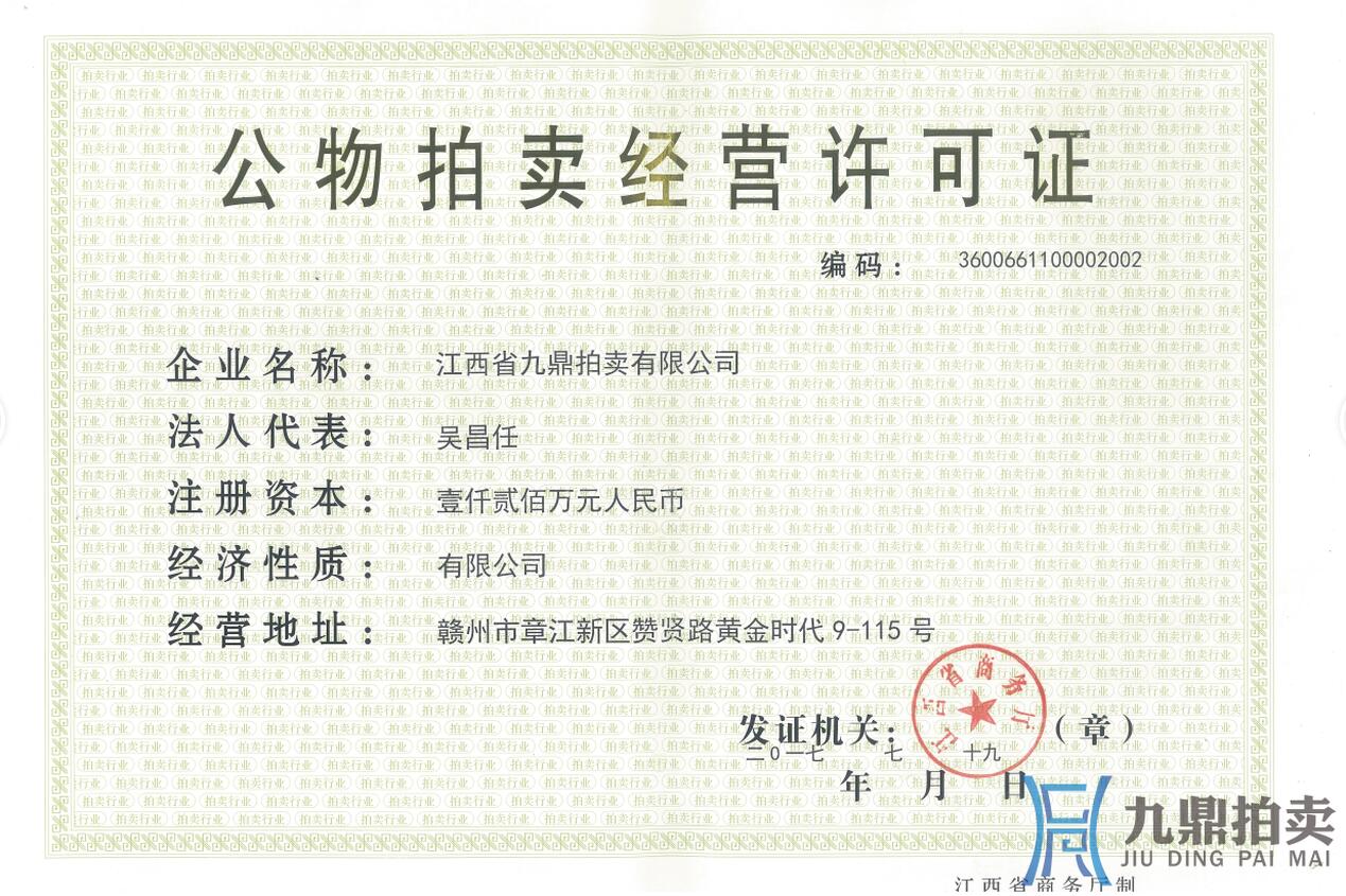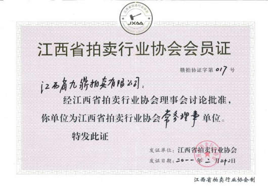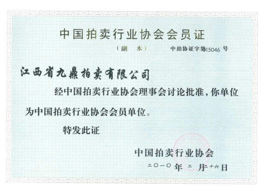 江西省九鼎拍賣有限公司是嚴格按照《中華人民共和國公司法》、《中華人民共和國拍賣法》等有關法律法規而成立的拍賣機構,是國家A級資質拍賣企業、中國拍賣行業協會會員單位、江西省公物拍賣指定單位、江西省拍賣行業協會常務理事單位,是目前江西省規模較大、起點較高的專業拍賣單位。公司遵照《中華人民共和國合同法》、《中華人民共和國拍賣法》等法律法規、政策,依法接受公民、法人或其他組織的委托,并提供財產鑒定評估、過戶代理等業務。